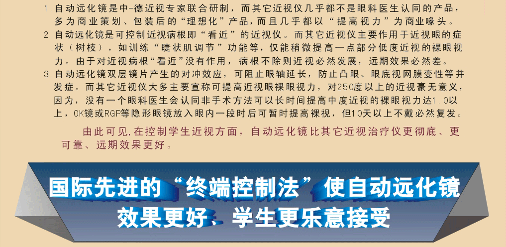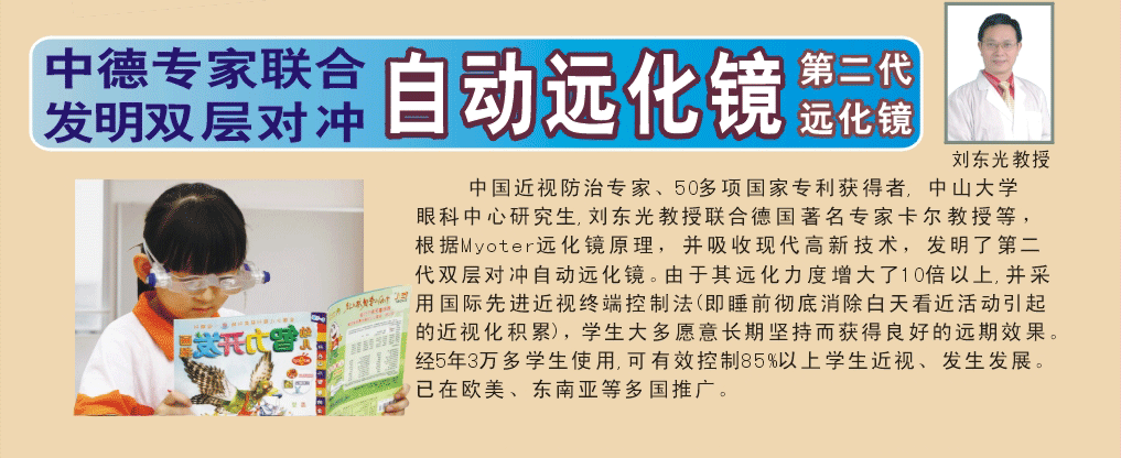 郑女士:我家孩子刚上初中,平时一有时间就喜欢看电视、玩电脑,写作业的时候老是趴在桌上写,前段时间他经常说眼睛不舒服,我和孩子他爸都很担心他会近视。我咨询了一个眼科医生朋友,他向我推荐了自动远化镜,听说是国内近视防控专家刘东光教授发明的,我就买了一副给孩子戴。现在已经用了半年了,带孩子去医院查视力,没有近视的迹象,看来自动远化镜效果还是不错的。