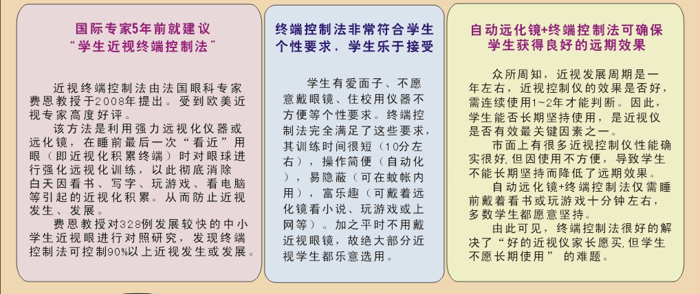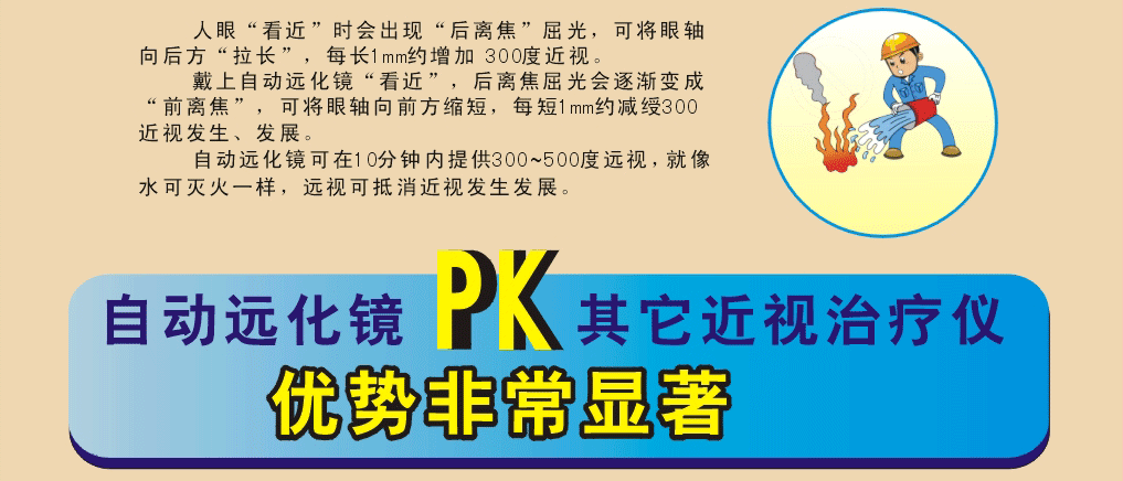 秦女士:自从小孩近视后,我们特别关注,试了很多种网上宣传的“治疗近视”的方法,最终发现都没有起到作用,也渐渐了解到近视是只能控制不能治疗的。最后在网上看到自动远化镜,它的远视化功能是专门针对近视发展的,可以从病根上控制近视。我们做了最后一次尝试,没想到这次竟然很有果,孩子度数总算控制住了。我觉得自动远化镜比那些很贵宣传效果很夸张的仪器好多了。