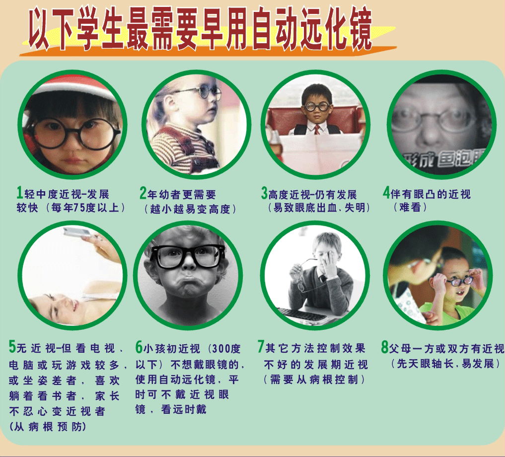 刘先生:孩子从6岁开始就发现有近视100度,我和孩子他妈妈都挺担心的,听医生说孩子近视了度数就只会升不会降了。去年孩子8岁,近视有250度,我们都很着急,度数照这样增长,以后得多少度啊,可我们都有好好照医生说的做,其它一起检查的孩子都没像我家孩子这样的。我看到有的孩子用远镜,我也就买了副自动远化镜试试,今年检查,度数涨了25度,虽然还没完全控制,但效果不错,所以我们打算给孩子长期使用自动远化镜。